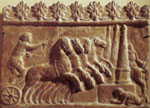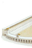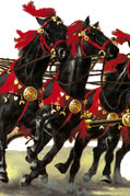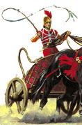 Os carros eran similares aos gregos: lixeiros, de dúas rodas, pechados por diante e abertos por detrás. E na súa caixa, o auriga ou cocheiro, sobre quen pesaba a responsabilidade de acadar o triunfo coa súa pericia e o perigo de perder a vida nalgún dos moitos accidentes que ocorrían. Os carros situábanse nas cocheiras - carceres en latín - pechadas cunha soga que se deixaba caer ao dar a partida. Cada carreira consistía en sete voltas en torno á spina do circo, un muro que dividía a pista en dous grandes carrís paralelos, totalizando un percorrido de oito mil trescentos metros. Sobre a spina, onde estaban os xuíces, había tamén sete delfíns de metal. |