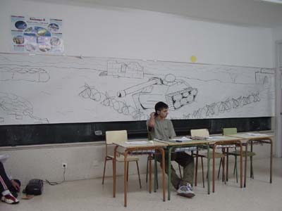 ZAPO.-Diga…Diga… A sus órdenes mi capitán... En efecto, soy el centinela de la cota 47... Sin novedad, mi capitán… Perdone, mi capitán, ¿cuándo comienza otra vez la batalla?... Y las bombas, ¿cuándo las tiro?... ¿Pero, por fin, hacia dónde las tiro, hacia atrás o hacia adelante? ... No se ponga usted así conmigo. No lo digo para molestarle... Capitán, me encuentro muy solo. ¿No podría enviarme un compañero?... Aunque sea la cabra... (El capitán le riñe.) A sus órdenes… A sus órdenes, mi capitán. (ZAPO cuelga el teléfono. Refunfuña.) . | |