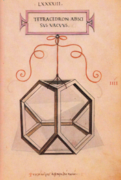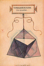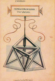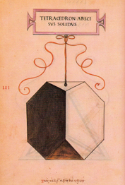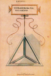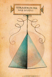 | O tetraedro elevado ou con puntas sólido ou oco ten igualmente dezaoito liñas, seis das cales son comúns, e tamén trinta e seis ángulos superficiais e oito sólidos, catro dos cales son o cumio das pirámides superficiais e catro son comúns ás cinco pirámides, é dicir, á interior, que o ollo non pode ver e só se capta mediante o intelecto, e ás outras catro exteriores; destas cinco pirámides componse o mencionado corpo cando son entre si triangulares equiláteras e equiángulas, coma a súa propia forma material nos demostra. As superficies que o revisten, impropiamente chamadas bases, son en total doce, e todas triangulares.