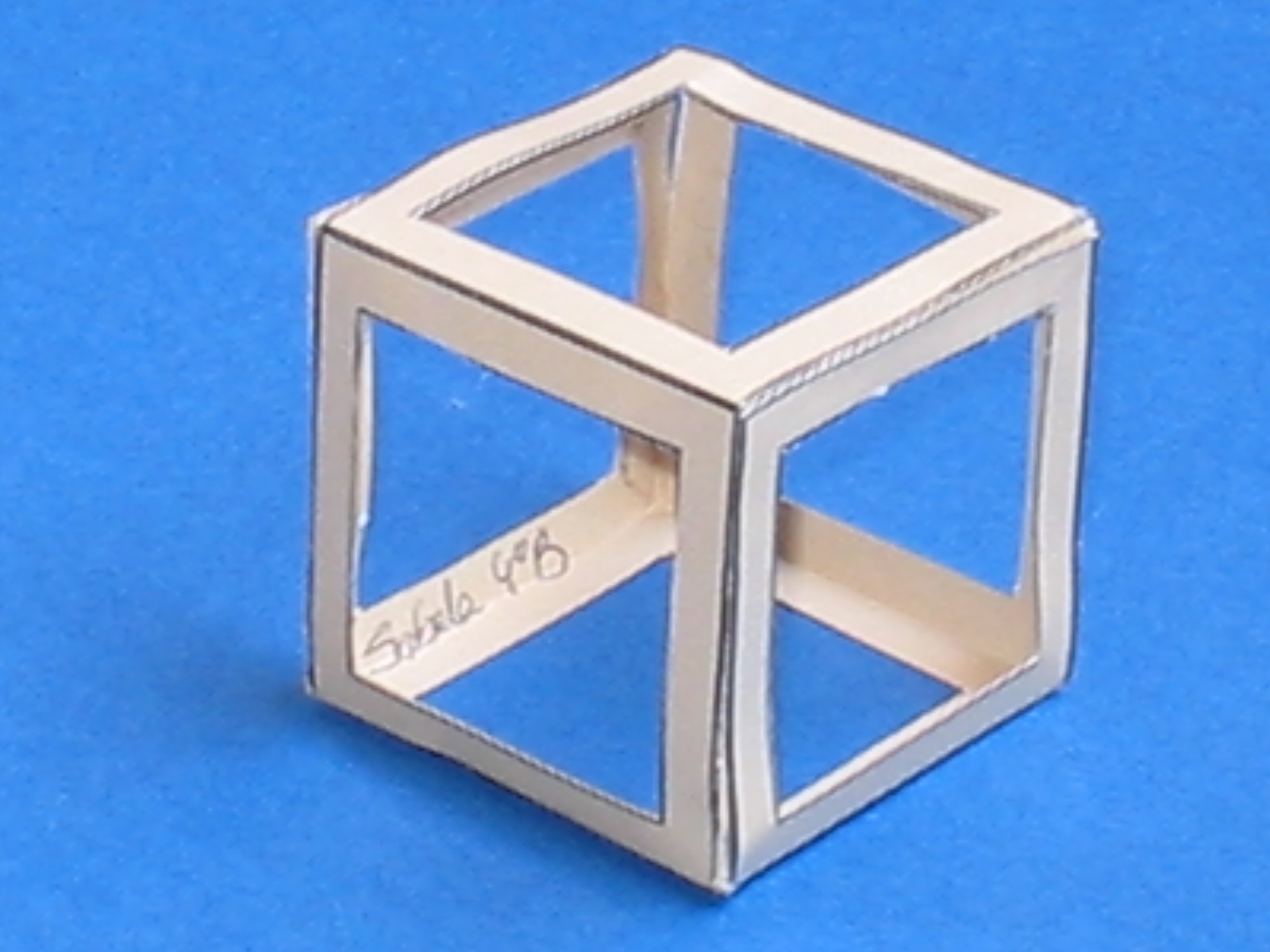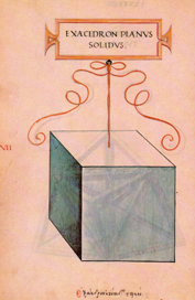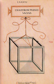 | O hexaedro ou cubo plano sólido ou oco ten doce liñas, lados ou costados, vintecatro ángulos superficiais, oito ángulos sólidos e seis bases ou superficies que o conteñen, todas cadradas, equiláteras e tamén equiángulas, semellantes á fora do diabólico instrumento chamado dado ou taxillo. |