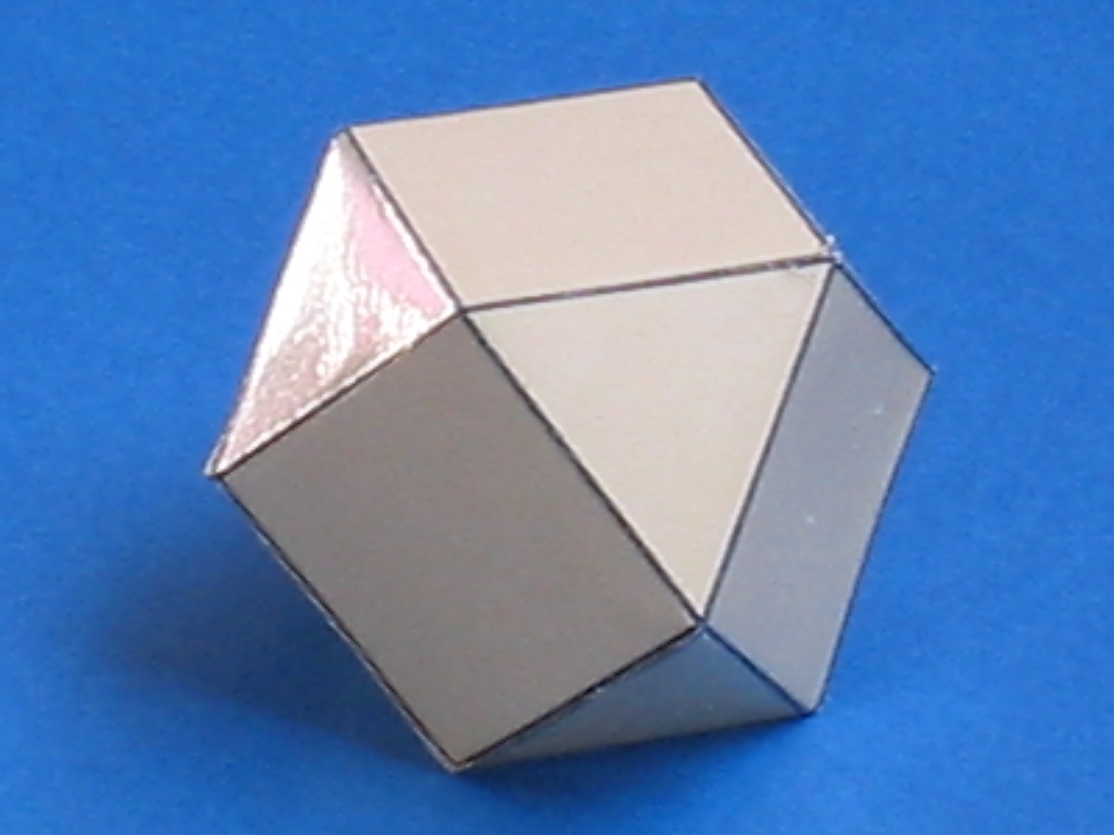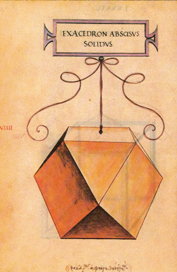 | O hexaedro despuntado ou absciso plano, igualmente sólido ou oco, ten vintecatro liñas que orixinan nel corenta e oito ángulos superficiais, vintecatro dos cales son rectos e os demais agudos; ten doce ángulos sólidos e está contido por catorce superficies ou bases, seis das cales son cadradas e oito triangulares. Todas as mencionadas liñas son comúns ás bases cadradas e ás triangulares, porque as seis cadradas unidas entre si angularmente dan lugar, de forma necesaria, a oito triángulos, como facían os hexágonos do tetraedro absciso. E este corpo orixínase do cubo mediante o corte uniforme na metade dos seus lados, como amosa de maneira evidente a súa propia forma material. |