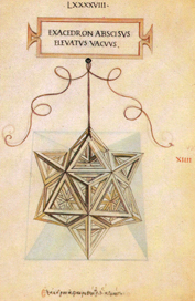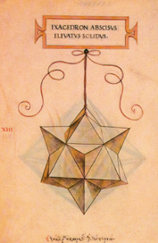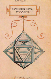 | O hexaedro absciso elevado, sólido ou oco ten setenta e dúas liñas, lados ou costados, que forman cento corenta e catro ángulos superficiais e catorce sólidos, todos eles piramidais. Destes, seis son de pirámides cuadrilateradas e oito de pirámides trilateradas. Das liñas mencionadas, vintecatro son comúns ás pirámides triangulares e cuadrangulares. Este corpo ten corenta e oito caras ou superficies que o circundan, todas elas triangulares, e componse do hexaedro cortado sólido interior, só perceptible polo intelecto, e de catorce pirámides, como se dixo. Colocado sobre un plano, sempre se apoia sobre tres conos ou puntas piramidais, como demostra a súa forma. |