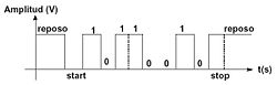 Isto se leva a cabo a través duns bits especiais que axudan a definir o contorno de cada código. No seguinte exemplo, podemos ver unha liña cun estado de reposo (1), pola que se transmite unha palabra de 8 bits enmarcada entre un bit de start (0) e un bit de stop (1).