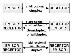 Neste caso podemos distinguir entre tres tipos de comunicacións nas redes segundo o fluxo de información entre o emisor e o receptor. As restriccións no sentido da comunicación poden vir dadas tanto polos dispositivos emisores ou receptores como pola propia liña de comunicación.