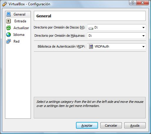 - Se se usa o programa VirtualBox, é conveniente configuralo antes de comezar a traballar con el para que almacene por omisión tanto os discos como as máquinas virtuais na unidade de DATOS. Poderemos facelo dende o menú de Archivos->Preferencias...: