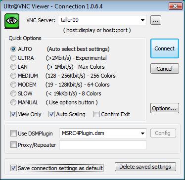 • VNC Server: Indicaremos o nome do equipo que queremos controlar. Os equipos das aulas se chaman tallerxx (na aula de 1º) e inforxx (na aula de 2º), onde xx é o número de equipo. Os equipos están numerados a partir do 00 que é o equipo do profesor, comezando pola primeira fila e no equipo que estea pegado á ventá (Por exemplo, o equipo do alumno que se senta na primeira fila pegado á venta será 01).