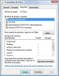 Exemplo de permisos dunha carpeta en Windows Vista