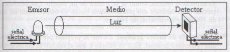 - A fonte de luz: Encárgase de converter un sinal dixital eléctrico nun sinal óptico. Xeralmente utilízase un pulso de luz para representar un "1" e a ausencia de luz para representar un "0". Esta fonte pode ser un diodo láser (emite un onda láser) ou un diodo LED.