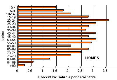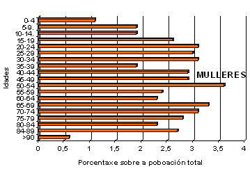 Tamén se nos mostra que nas idades baixas hai algúns máis homes que mulleres pero a partires de 45-49 anos empezan a baixar os homes e a ser maioría de mulleres, esta tendencia acentúase a medida que subimos en idade recordemos que a esperanza de vida para as mulleres é de 83 anos e para os homes de 78.