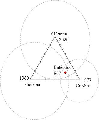 O eutéctico de mínimo punto de solidificación é o formado por 59,3% de criolita , 23% de fluorina e 17,7% de alúmina con unha temperatura de fusión de 867ºC.