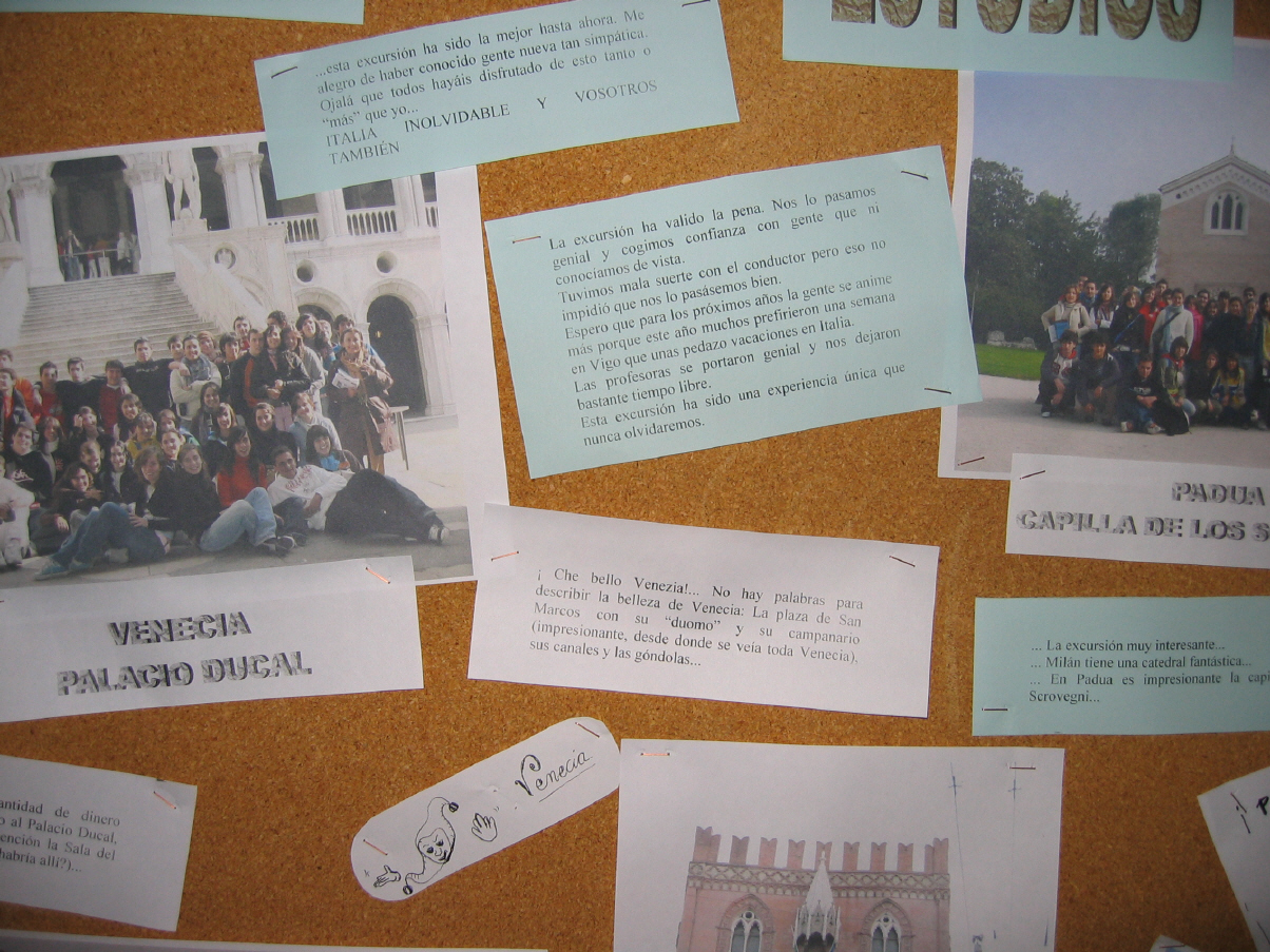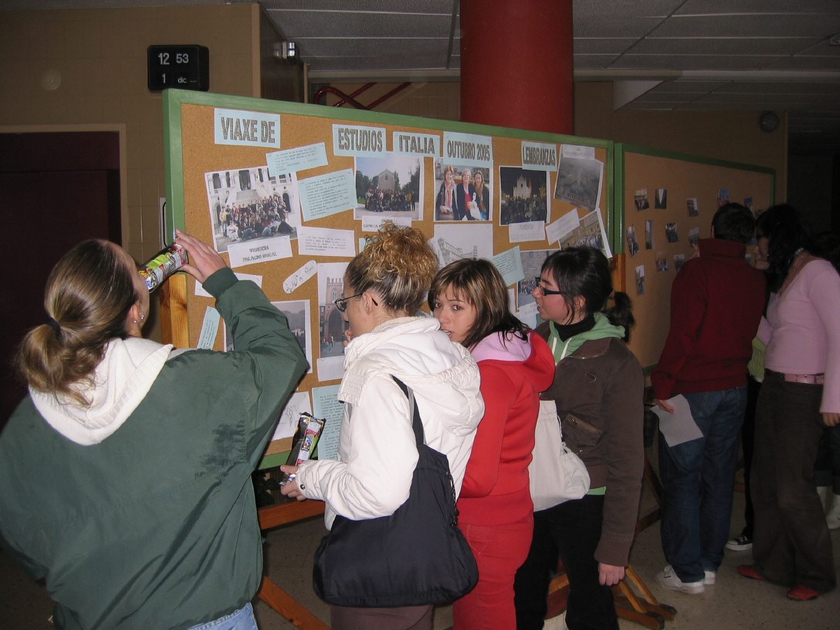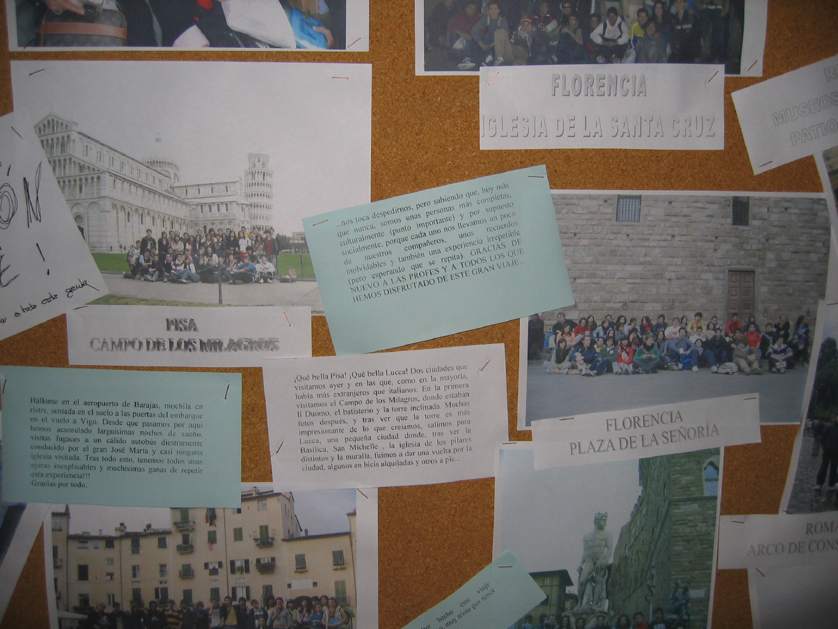 Milán: Catedral, Galerías de Vittorio Enmanuelle, Castelo dos Sforza... Venecia: Catedral, Pazo do Dux ... Padua: Capela dos Scrovegni, Básilica de S. Antonio... Bolonia:Soportais, as dúas torres, universidade ... Pisa: Campo dos Milagres... Lucca: Centro histórico, San Miguel ... Florencia: Praza da Señoría, Pazo Vechio, Galería da Academia, Catedral e Baptisterio, Igrexa da Santa Cruz, Ponte Vechio, Galería dos Uffici, Capela dos Médici, mercado... Siena: Catedral, Praza do Palio... Roma: Museos Vaticanos, Basílica de San Pedro, cúpula, Praza Nabona, Panteón, Santa María sopra Minerva, Il Gesú, Fontana de Trevi, Praza de España, Mercados de Trajano, Capitolio, Foro Romano, Coliseo, Arco de Constantino, San Pietro in Víncoli, Catacumbas ...