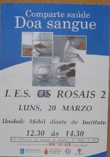 O luns, 20 de Marzo o alumnado de 2º de Bacharelato poderá doar sangue na unidade móbil do Centro de Transfusión de Galicia desplazada ao Centro. A doazón de sangue é un acto voluntario, universal e gratuito. Pode doar sangue calquera persoa maior de 18 anos cunha saúde normal, con máis de 50 kg de peso e que non padeza nin teña padecido enfermidades transmisibles polo sangue. É un proceso sinxelo, dura uns dez minutos e en todo momento está controlado por persoal sanitario especializado.