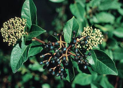 Características Arbusto de folla perenne de 2-4 m de altura, aínda que a súa altura máxima común habitual en setos é de 2 m -A súa forma é redondeada. Follas opostas, coriaceas e enteras de cor verde intenso no haz e máis claro no envés con mechitas de pelos nas horcaduras dos nervios. - Flores brancas pequenas, en corimbo. O froito é unha drupa ovoide de cor azul metálico e ligxeiramente aromático. Florece durante todo o invierno e primavera, fructificando .
