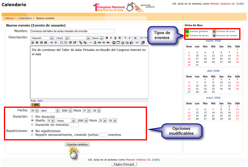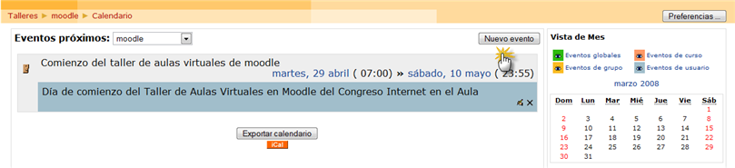 El botón [Nuevo evento] nos posibilita crear un nuevo evento en el calendario de actividades. Éste estará dirigido sólo para alumnos y no para el grupo o curso. Luego podremos mantener nuestra propia agenda de actividades.