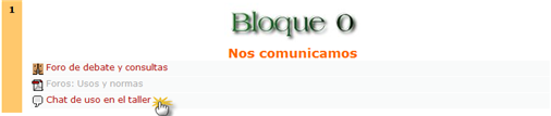 Moodle nos permite una comunicación síncrona de los participantes de un curso. Para que esta se produzca los participantes deben estar conectados en en aula al mismo tiempo. Aparecería, en nuestra aula virtual, así:
