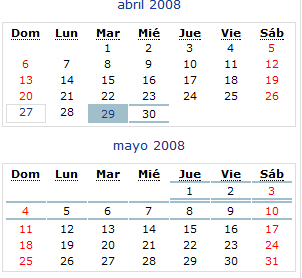 Observamos que, como el nuevo evento se programa desde el 29 de abril hasta el 10 de mayo, aparece el 29 de abril en azul y por repetir este evento los demás días aparecen subrayados.
