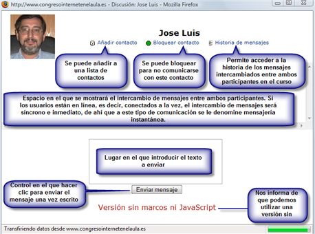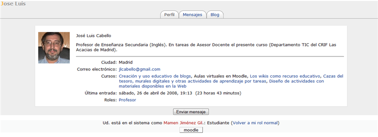 Nos indicaría aquellos datos que pusimos al inscribirnos y los que modificamos cuando actualizamos nuestro perfil, como veremos en la siguiente sección. Además, presenta la dirección de correo marcada como un enlace. Si hacemos clic sobre ella, se nos permite enviarles un correo electrónico o mejor, en el aula virtual, hacer clic en el botón Enviar mensaje, con lo que nos aparecerá la siguiente ventana: