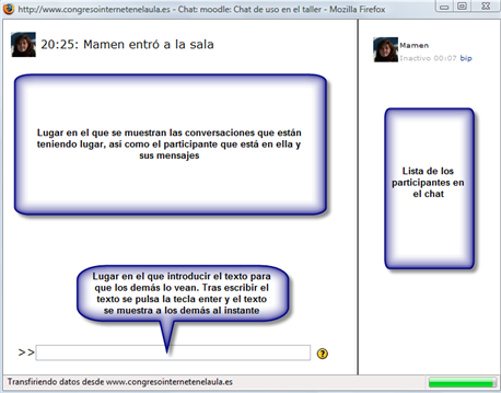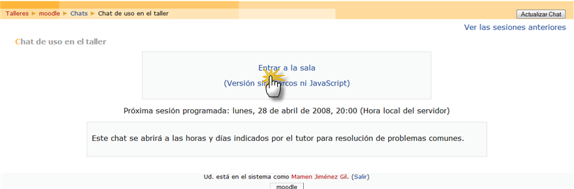 Moodle nos permite una comunicación síncrona de los participantes de un curso. Para que esta se produzca los participantes deben estar conectados en en aula al mismo tiempo. Aparecería, en nuestra aula virtual, así: