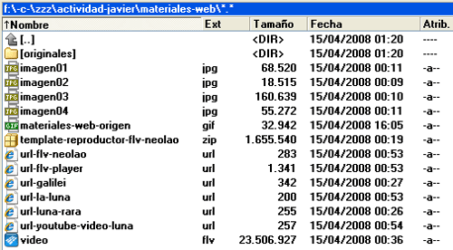 Para comenzar la realización de la actividad abrimos cada cual una carpeta local en nuestro ordenador de trabajo donde alojaremos materiales y desarrollo web. En la imagen anterior utilizaré como carpeta de trabajo -\actividad-javier\- donde pongo una sub-carpeta -\materiales-web\- y otra para -\originales\- . Observad que guardo tanto recursos como url-s o link-s.