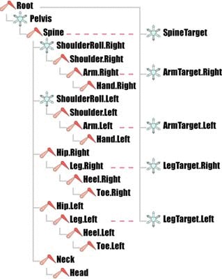 This makes it easy to show or hide layers to reveal just the mesh or the skeleton, to easily locate the control empties or to hide the deformation objects. Depending on the complexity of your skeletal system you may want more or fewer layers. Putting a character's finger IKAs on a layer of their own would it much easier to select and focus on the small bones without accidentally selecting items in the rest of the character's skeleton. |