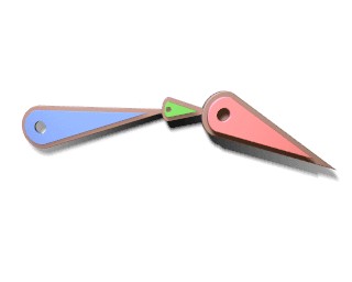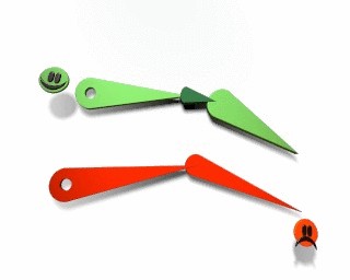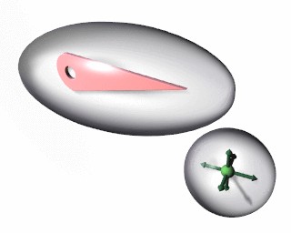 The limitation of the three number XYZ rotations is less intuitive. This so-called Euler rotation is not uniform - the same rotation can be expressed with different numbers - and has the bothersome effect that it is not possible to rotate from any position to another, the infamous gimbal lock. While working with different rotation keys, the user may suddenly be confronted with quite unexpected interpolations, or it may turn out to be impossible to force a particular axis rotation when making manual changes. Here, also, a better solution is to work with a hierarchy. A Parent will always assign the specified axis rotation to the Child. (It is handy to know that the X, Y and Z rotations are calculated one after the other. The curve that affects the "RotX" channel, always determines the X axis rotation).