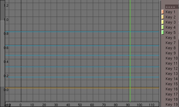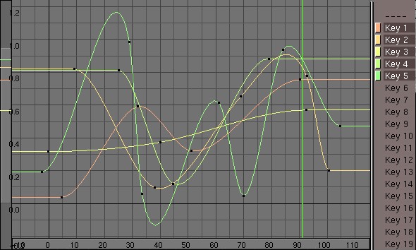 The Key lines in the IpoWindow can be placed at any vertical position. Select the line and use Grab mode to do this. The IpoCurve can also be processed here in the same way as described in the previous section. Instead of a 'value', however, the curve determines the interpolation between the Keys, e.g. a sine curve can be used to create a cyclical animation.