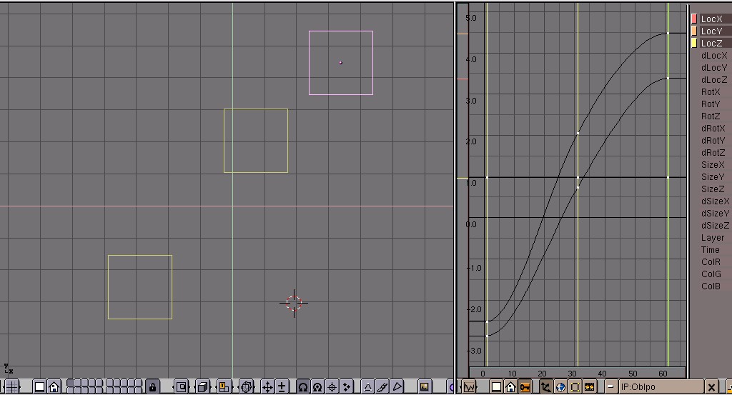 In this way, you can create the animation by paging through the frames, position by position. Note that the location of the object is directly linked to the curves. When you change frames, the Ipos are always re-evaluated and re-applied. You can freely move the object within the same frame, but since you have changed frame, the object 'jumps' to the position determined by the Ipo.
