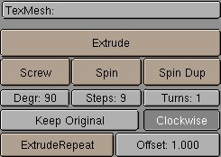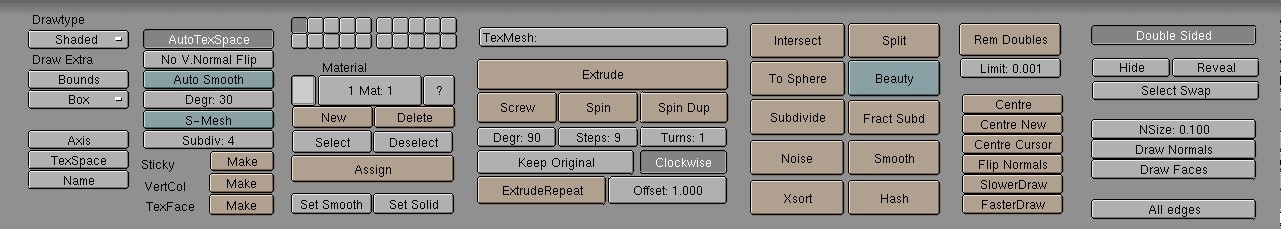 The settings in this ButtonsWindow visualise the ObData blocks and provide tools for the specific EditModes. Certain buttons are redrawn depending on the type of ObData. The types are: Mesh, Curve, Surface, Text, MetaBall, Lattice, Ika and Camera.