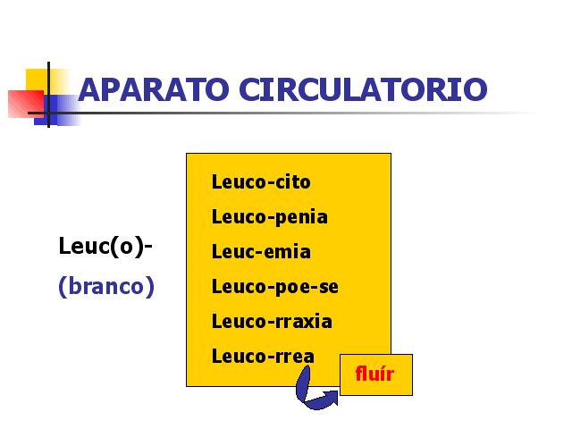 Leucocito.- Célula incolora nucleada do sangue que constitúe a fracción das células brancas do mesmo. Leucopenia.- Número de leucocitos por debaixo das cifras consideradas normais. Leucemia.- Enfermidade neoplásica dos órganos produtores das células sanguíneas, caracterizada pola proliferación maligna dos tipos celulares presentes na médula ósea. Leucopoiese (leucopoese).- Proceso de formación dos leucocitos. Leucorrea.- Fluxo abrancazado procedente da vaxina ou da cavidade uterina. Leucorraxi.- Leucorrea abondosa. |