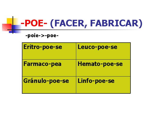 | Eritropoese.- Conxunto de procesos celulares que levan á produción das hemacias. Leucopoese.- Proceso de formación dos leucocitos. Farmacopea.- Tratado oficial de cada país que determina a normativa legal sobre todo o relacionado cos fármacos. Hematopoese.- Proceso de produción dos elementos constitutivos so sangue. Granulopoese.- Proceso de formación e maduración dos granulocitos no sangue. Linfopoese.- Proceso da produción da linfa. |