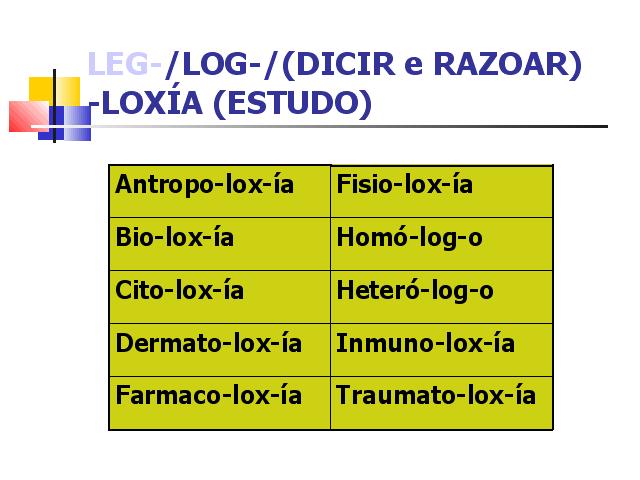 | Antropoloxía.- Ciencia que ten por obxecto o estudo e clasificación dos caracteres físicos dos grupos humanos. Fisioloxía.- Ciencia que estuda as funcións e as propiedades dos órganos e dos tecidos dos seres vivos. Bioloxía.- Ciencia que estuda os organismos vivos, os fenómenos vitais e as súas leis. Homólogo.- Relativo aos órganos pares, iguais entre si ou a cada unha das metades correspondentes dun órgano impar. Citoloxía.- Ciencia que trata das células, da súa estrutura e funcións. Heterólogo.- Que está constituído por un tecido anormal para a parte da que se trata. Dermatoloxía.- Parte da medicina dedicada ó diagnóstico e tratamento das doenzas da pel. Inmunoloxía.- Ciencia que estuda os procesos inmunitarios nos seres vivos. Farmacoloxía.- Ciencia que estuda os medicamentos e a súa acción sobre o organismo. Traumatoloxía.- Rama da medicina que se ocupa do estudo e tratamento dos traumatismos. |
