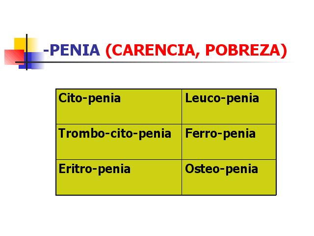 | Citopenia.- Redución do número de elementos celulares no sangue . Leucopenia.- Número de leucocitos por debaixo das cifras consideradas normais. Trombocitopenia.- Diminución do número de plaquetas do sangue. Ferropenia.- Diminución da cantidade normal de ferro no organismo. Eritropenia.- Déficit no número de hemacias. Osteopenia.- Calquera dos trastornos óseos nos que existe perda de masa ou densidade esquelética. |