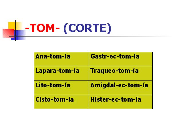 | Anatomía.- Ciencia que estuda a estrutura ou morfoloxía dos organismos. Gastrectomía.- Incisión cirúrxica da parede do estómago. Laparotomía.- Incisión cirúrxica realizada na parede abdominal. Traqueotomía.- Incisión cirúrxica realizada na traquea. Litotomía.- Extracción dun cálculo urinario mediante unha incisión na vexiga ou na porción membranosa da uretra. Amigdalectomía.- Extirpación das amígdalas. Cistotomía.- Creación dunha abertura na vexiga urinaria, que serve para a extracción de cálculos ou corpos estraños. Histerectomía.- Extirpación total ou parcial do útero. |