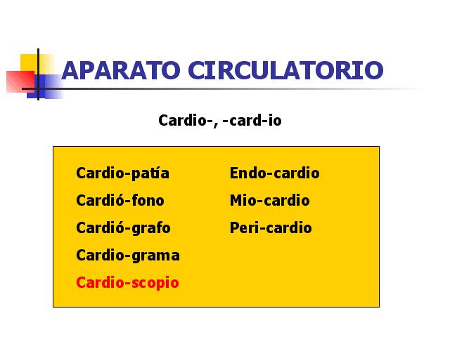 Cardiopatía.- Calquera enfermidade conxénita ou adquirida do corazón. Cardiófono.- Estetoscopio que permite oí-lo son das contraccións do músculo cardíaco. Cardiógrafo.- Instrumento que se coloca na rexión cardíaca e indica graficamente a forza e forma das sístoles e diástoles. Cardiograma.-Trazado obtido co cardiógrafo. Cardioscopio.- Instrumento para a exploración dos movementos do corazón. Endocardio.- Membrana endotelial que recobre a superficie interna das cavidades do corazón e as válvulas cardíacas. Miocardio.- Músculo cardíaco do corazón localizada entre o endocardio e o pericardio. Pericardio.- Saco membranoso, de natureza fibroelástica, que rodea o corazón. |