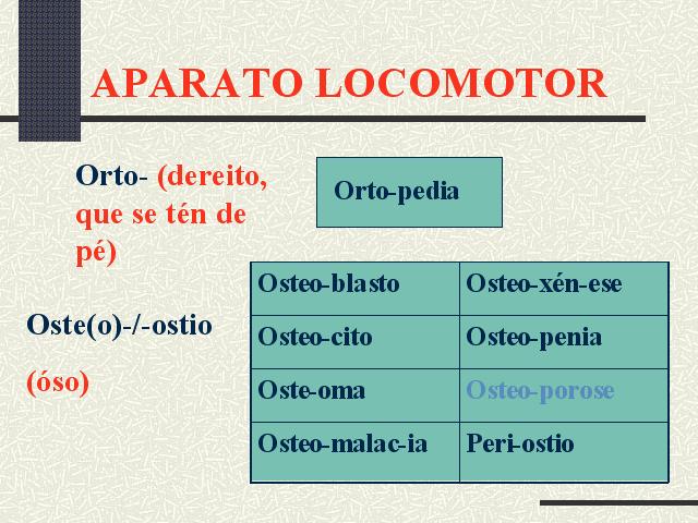 | Ortopedia.- Corrección mecánica ou cirúrxica das desviacións e deformidades en xeral. Osteoblasto.- Célula produtora de tecido óseo. Osteocito.- Célula ósea que hai na estrutura íntima do tecido óseo. Osteoma.- Tumor duro de estrutura semellante á do tecido óseo. Osteomalacia.- Trastorno metabólico dos ósos, consistente nunha deficiente mineralización na matriz ósea e que se caracteriza pola brandura progresiva dos ósos. Osteoxénese.- Desenvolvemento do tecido óseo. Osteopenia.- Termo xeral que designa os trastornos de remodelación ósea nos que existe perda de masa ou de densidade esquelética. Osteoporose.- Formación de espacios anormales no óso. Periostio.- Membrana fibrosa pegada aos ósos, que os recubre e vale para a súa formación, nutrición e renovación. |