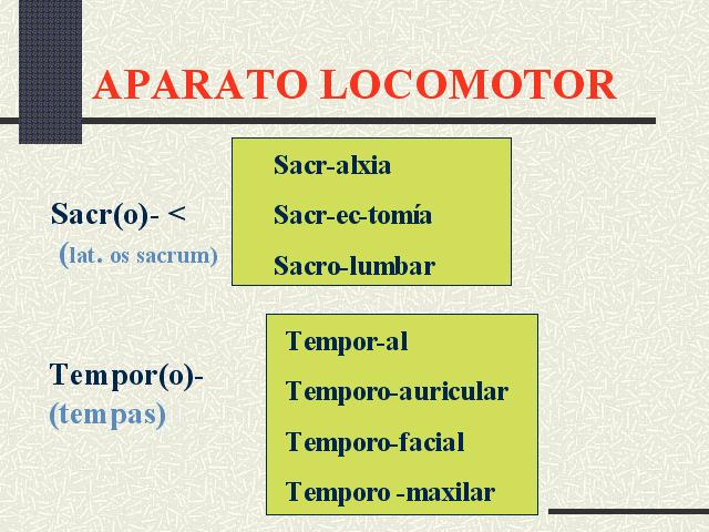| Sacralxia.- Dor no sacro. Sacrectomía.- Escisión do sacro ou dunha parte do mesmo. Sacrolumbar.- Relativo ao sacro e aos lombos. Temporal.- Relativo ou pertencente ás tempas ou ao óso ou músculos temporais. Temporoauricular.- Relativo ás rexións temporal e auricular. Temporofacial.- Relativo ás tempas e á cara. Temporomaxilar.- Relativo aos ósos temporal e maxilar inferior. |