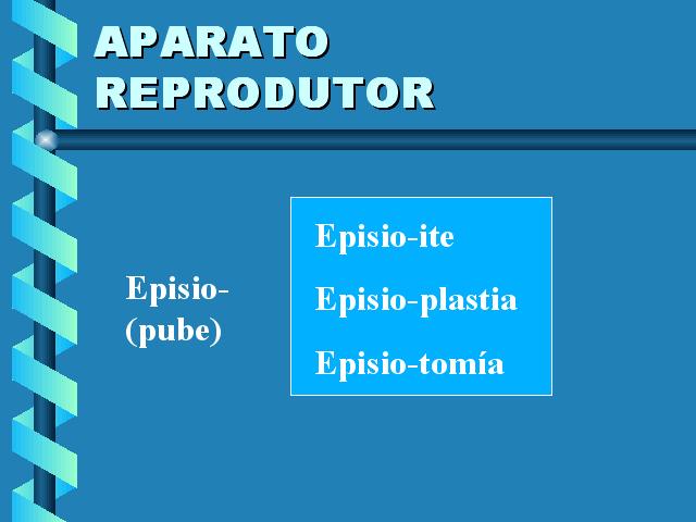 | Episioíte.- Inflamación da vulva. Episioplastia.- Ciruxía plástica da vulva. Episiotomía.- Incisión cirúrxica lateral do orificio vulvar no momento do desprendemento da parte fetal, para evitar que se produza espontaneamente un desgarro grave do perineo. |