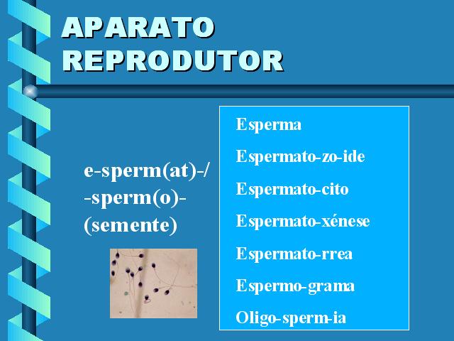 | Esperma.- Líquido exaculado que contén os espermatozoides e as secrecións das glándulas anexas do aparato reproductor masculino. Espermatozoide.- Gametos masculinos. Espermatocito.- Pode ser primario (célula que se forma a partir do espermatogonio) ou secundario (cada unha das duas células nas que se subdivide o espermatocito primario). Espermatoxénese.- Proceso de formación de espermatozoides que ten lugar nos túbulos seminíferos dos testículos. Espermatorrea.- Derrame excesivo, frecuente e involuntario do semen, sen coito e a veces sen erección. Espermograma.- Reconto de espermatozoides e descrición de formas anormais. Oligospermia.- Secreción seminal deficiente. |