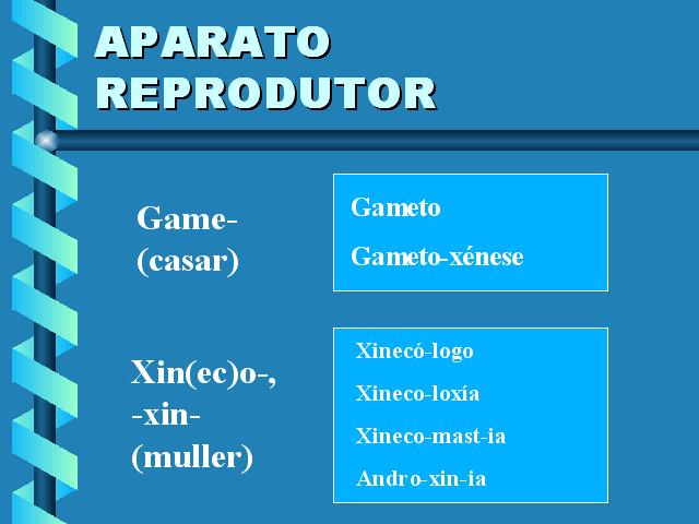 | Gameto.- Célula sexual. Gametoxénese.- Proceso de formación de gametos, masculinos ou femininos. Xinecólogo.- Experto en xinecoloxía. Xinecoloxía.- Rama da medicina que trata da muller e as enfermidades que lle son propias relacionadas co aparato reprodutor. Xinecomastia.- Volume excesivo das mamas no home. Androxinia.- Seudohermafrodita masculino. |