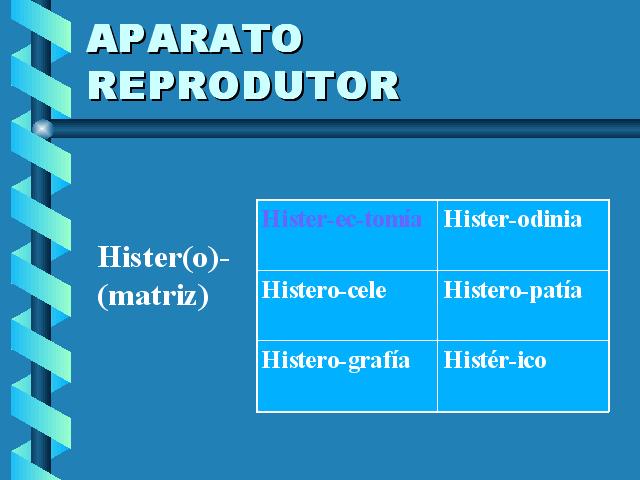 | Histerectomía.- Operación para extirpar parcial ou totalmente o útero por vía abdominal ou vaxinal. Histerocele.- Hernia do útero. Histerodinia.- Dor neurálxica do útero. Histerografía.- Radiografía do útero. Histeropatía.- Termo xeral para as afeccións do útero. Histérico.- Relacionado coa histeria (psiconeurose que presenta diversas formas clínicas). |