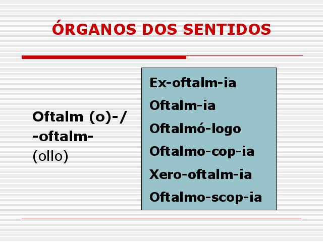 | Exoftalmia.- Protrusión ou proxección anormal do ollo. Oftalmia.- Inflamación grave do ollo con irritación constante da conxuntiva. Oftalmólogo.- Oculista. Oftalmocopia.- Vista cansada; astenopia. (Kopos: pena, fatiga) Xeroftalmía.- Enfermidade dos ollos caracterizada pola sequedade da conxuntiva e opacidade da córnea. Oftalmoscopia.- Exploración do interior do ollo. |