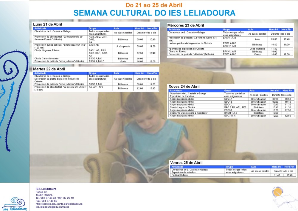 Do 21 ao 25 de Abril de 2008 o IES Leliadoura celebrará a Semana Cultural na que se realizarán as seguintes actividades: